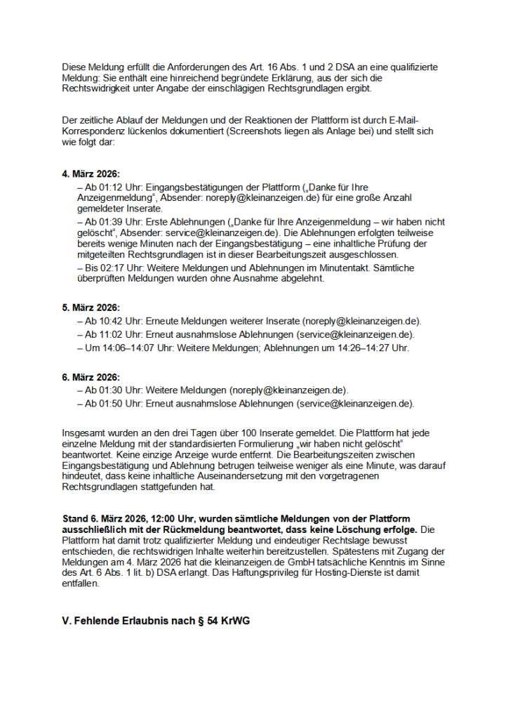 Andreas Witte hat am 4., 5. und 6. März 2026 über 100 Bahnschwellen-Inserate gemeldet — jeweils mit einer detaillierten Begründung unter Angabe der REACH-Verordnung und der Altholzverordnung. Die Plattform hat jede einzelne Meldung abgelehnt mit der standardisierten Formulierung „wir haben nicht gelöscht“. Die Bearbeitungszeit zwischen Eingangsbestätigung und Ablehnung betrug teilweise weniger als eine Minute. Eine inhaltliche Prüfung der vorgetragenen Rechtsgrundlagen hat erkennbar nicht stattgefunden.