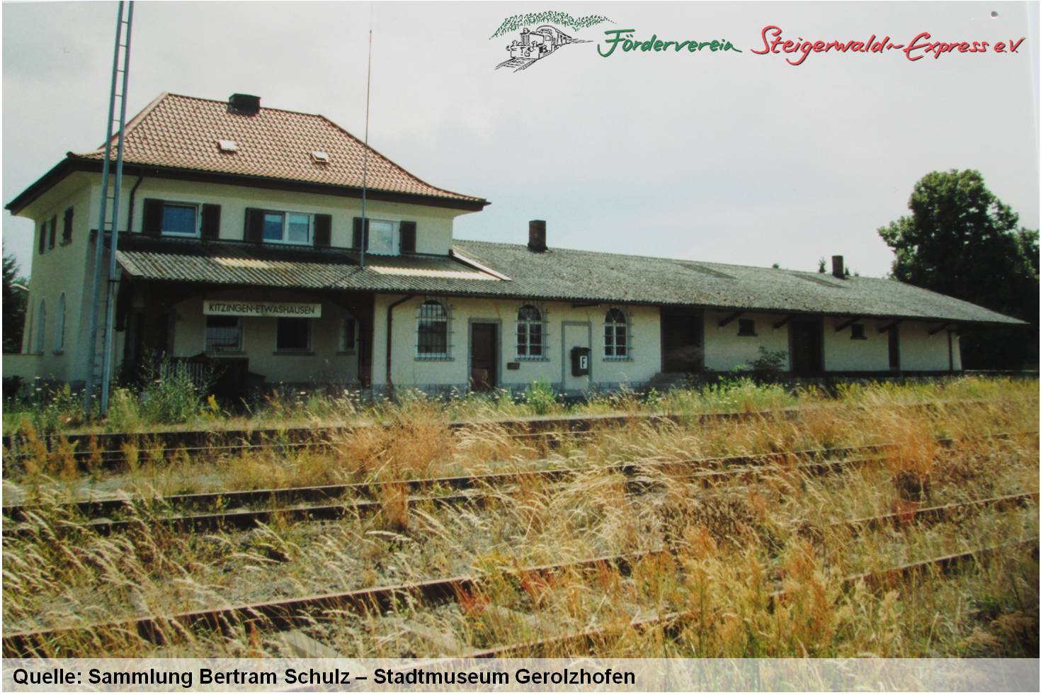 Im Dritten Reich wurde 1935 der Kitzinger Militärflughafen ausgebaut. In diesem Zusammenhang wurde die alte kleinere Haltestelle Kitzingen-Etwashausen, welche zwischen der Albertshofener und Stadtschwarzacher Straße lag, um 300m Richtung Gerolzhofen verlegt und zum Bahnhof ausgebaut. Dazu gehörte das heute noch erhaltene Empfangsgebäude mit dem Güterschuppen. Bis in die 1980er Jahre besaß der Bahnhof sogar eine eigene Rangierlok, eine Kö 2, die alle paar Wochen gewechselt wurde. Mit Ablauf des 1. Januar 2002 wurde der Gütertarifpunkt Etwashausen für den Einzelladungsgüterverkehr eingestellt.