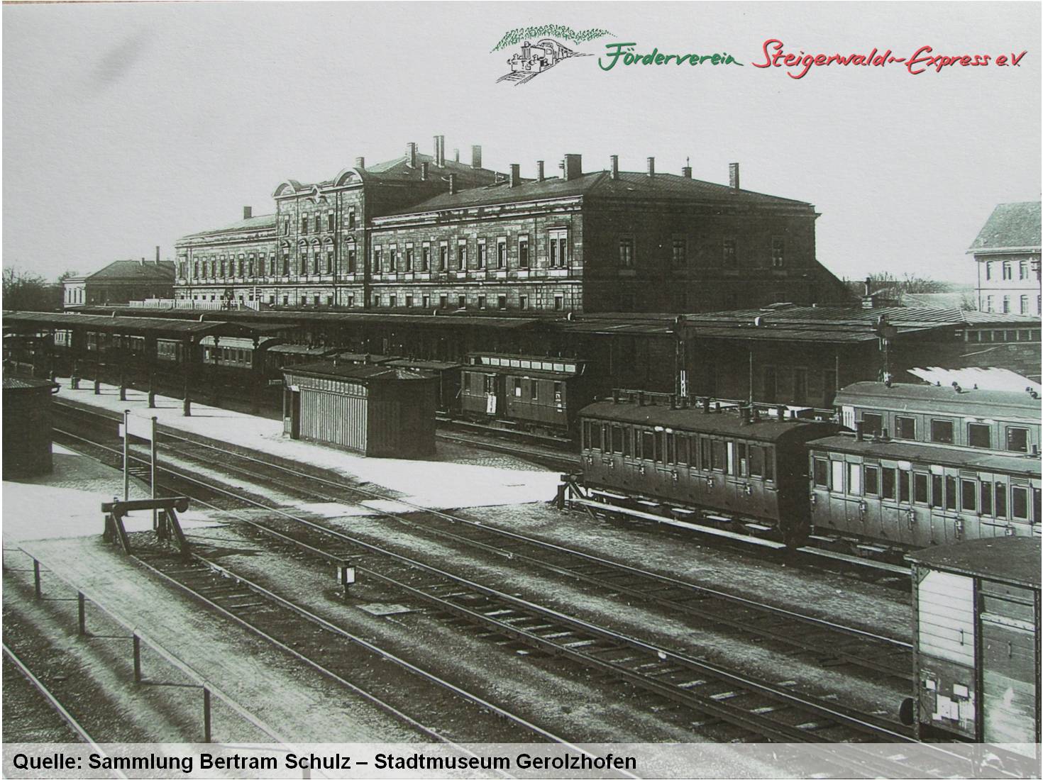 Der 1874 angelegte „Oberndorfer Rangier-und Güterbahnhof“ wurde zunächst als Bahnstation Oberndorf – Schweinfurt bezeichnet und 1876 mit der Errichtung eines aufwendigen Hauptgebäudes zu einem vollwertigen (Stadt-) Bahnhof ausgebaut. Erst im Mai 1903 erhielt er auf nachhaltiges Schweinfurter Drängen hin den Namen „Centralbahnhof Schweinfurt“ (2,44km vom alten 1852 eröffneten „Stadtbahnhof“ entfernt). Etwas später (1903/04) wurde der Centralbahnhof in Hauptbahnhof umgetauft. Die beiden Aufnahmen zeigen den Blick auf das Bahnhofsgelände (vom Anfang April 1903 freigegebenen Fußgängersteg) auf dem ein eigenes Stutzengleis für die Lokalbahn am dritten „Perron“ angelegt wurde.
