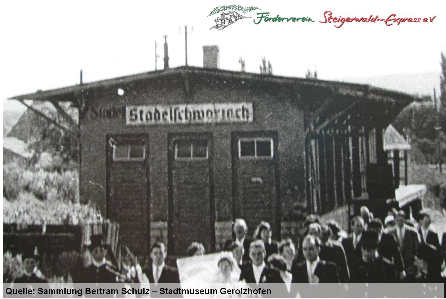 Nach der Überquerung der imposanten Brücken über die Schwarzach und die B22 erreicht man den ehemaligen Bahnhof Stadelschwarzach. Die Betriebsstelle besaß in früheren Zeiten vier Weichen samt Anschlussgleis. Seit 1969 nur noch eine unbesetzte Haltestelle, wurde das am östlichen Ortsrand mit Fachwerk versehene streckentypische Bahngebäude im September 1971 abgerissen und durch einen Betonunterstand ersetzt. Nach Einstellung des Güterbedienung zum Sommer 1990 entfernte man das restliche Ladegleis.